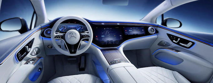 MBUX Hyperscreen系統的貫穿式OLED大屏由不規則造型的曲面玻璃打造,三塊液晶屏幕完整一體,覆蓋了整個中控區域。操作方面,無論是否選裝MBUX Hyperscreen系統,奔馳EQS中控區域都取消了絕大部分實體按鍵,以觸摸操作代替。更重要的是,MBUX Hyperscreen系統還搭載了8CPU24GB內存、46.6GB/s帶寬的硬件,讓操作更加迅速,處理信息更加高效。