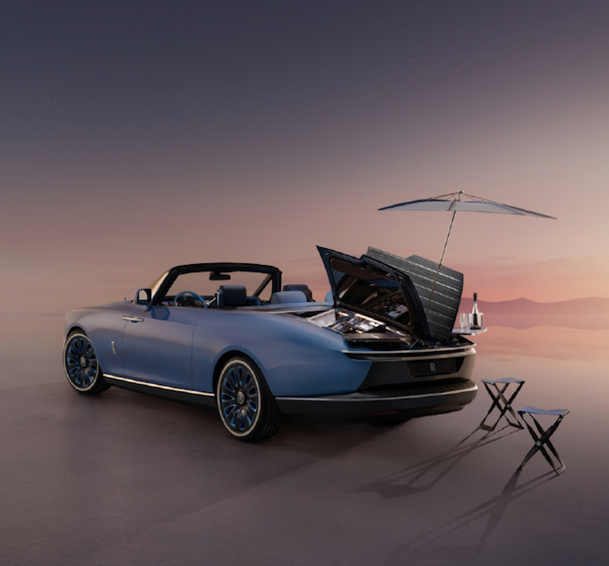 鬼面罩依然採用勞斯萊斯經典的「帕特農神廟」設計,但頭燈更加扁平和細長的尾燈相互輝映。車尾展示了最好的手工設計和尖端的工程技術。因為在傳統後備廂的位置,勞斯萊斯為其定制了類似於遊艇甲板般的待客區。「甲板」由灰黑色開孔Caleidolengo飾板製成,中間還設計了一把可折疊的專屬太陽傘,甚至在「甲板」下層還準備了兩張由勞斯萊斯設計、意大利傢具品牌Promemoria精心打造的雞尾酒凳。在內部,則是為用打造的一整套戶外用餐的餐具,以及可以在6攝氏度下快速冷藏的香檳冰箱。